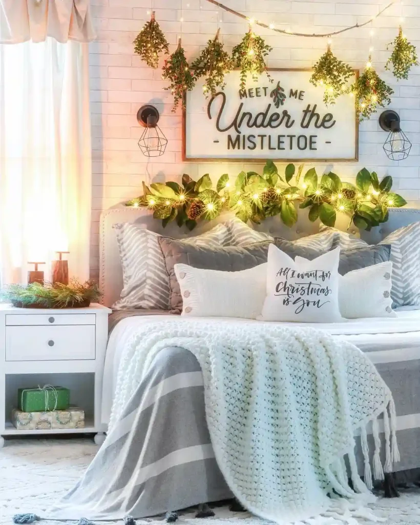 Romantic and playful, this bedroom glows with Christmas charm. The “Meet Me Under the Mistletoe” sign sets a flirty, festive tone, while greenery and string lights frame the bed in a warm golden glow. Soft striped throws and layered textures add coziness. It’s a whimsical setup that feels magical — like waking up in a holiday fairytale.