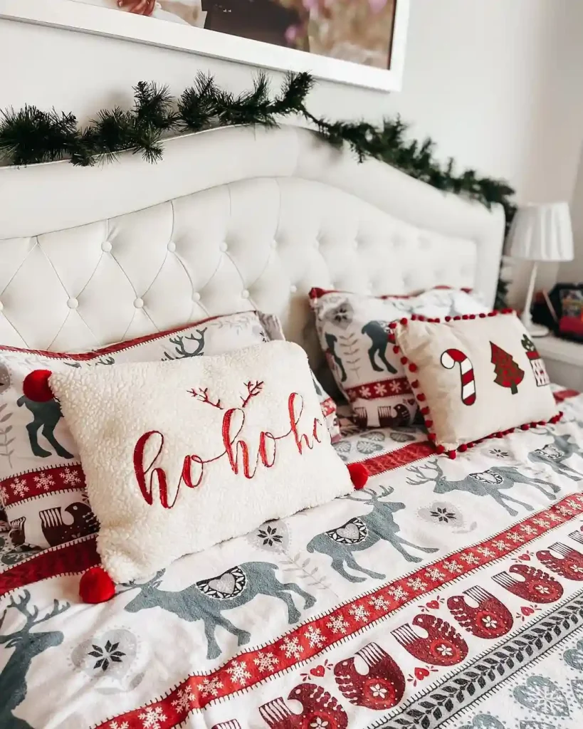 This room nails the Nordic Christmas look with cozy reindeer bedding and fluffy “ho ho ho” pillows. The playful patterns in red, white, and grey create a whimsical feel that’s festive but still stylish. A simple garland on the tufted headboard adds greenery without clutter, keeping the overall look clean and cheerful.