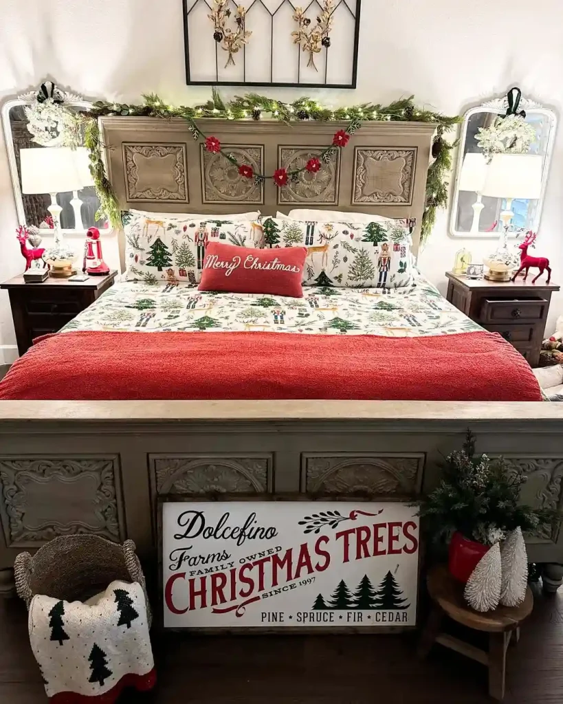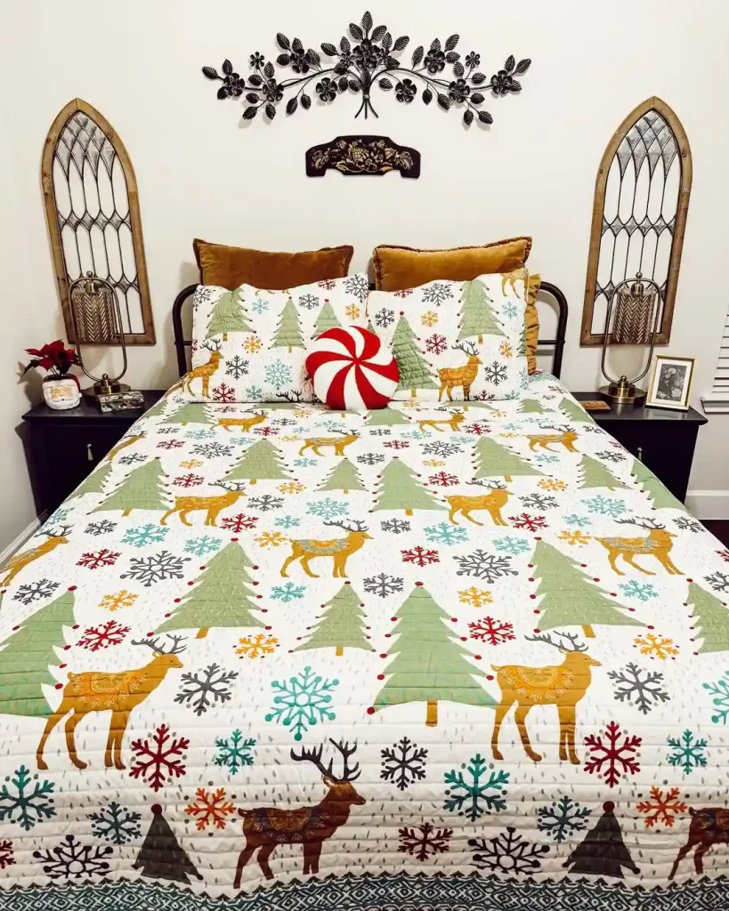 Bright, colorful, and fun, this bedroom brings out the childlike joy of Christmas. The reindeer and tree-print bedding makes a cheerful statement, while the peppermint pillow adds a cute, playful accent. Golden velvet pillows bring warmth, and the symmetrical wall decor gives balance. It’s a cozy, lighthearted take on Christmas bedroom decor that’ll make anyone smile.