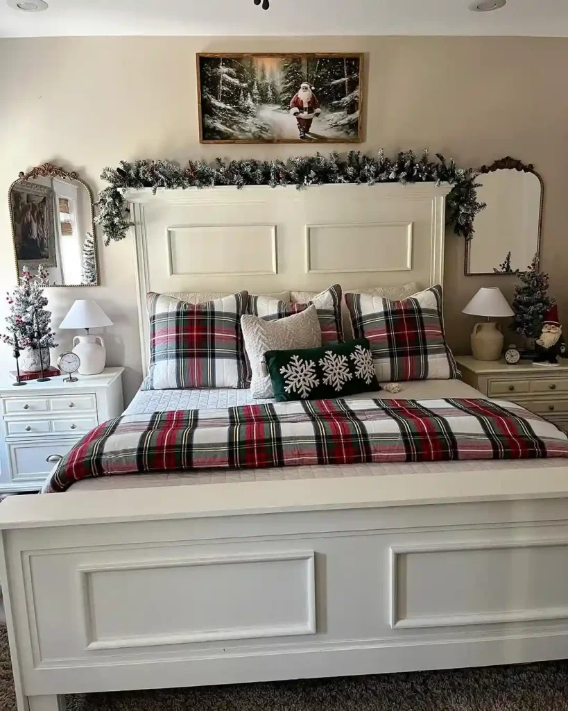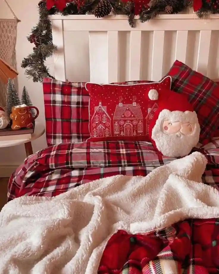 This simple yet heartwarming Christmas setup uses bold red plaid bedding and festive pillows for instant holiday charm. The Santa and gingerbread pillows add a cute touch, while the pine garland above the bed creates a natural frame. Soft blankets make the space feel snug — it’s the kind of bed that makes you want to stay in with a mug of cocoa and a classic Christmas movie.
