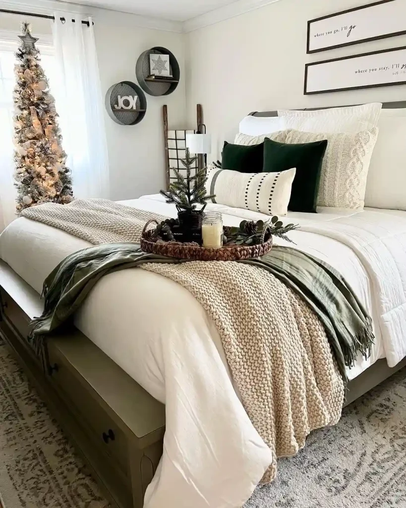 13. Soft Neutral Christmas Bedroom with Green Accents
