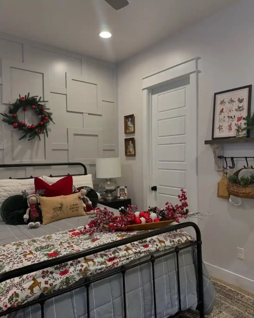 This playful room mixes woodland prints, festive greenery, and cozy textures to create a joyful Christmas retreat. The iron bed frame adds a rustic touch, while red berries and ornaments across the blanket bring lively color. A wreath with red accents completes the festive scene, balancing charm and coziness in the perfect way.