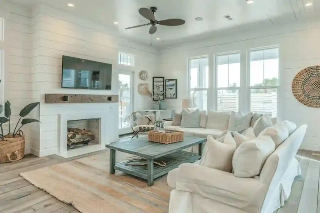 A warm and inviting living space that embraces the essence of a beach cottage. White shiplap walls and a reclaimed wood mantel create a rustic, coastal feel, while oversized sectional seating keeps the space comfortable.