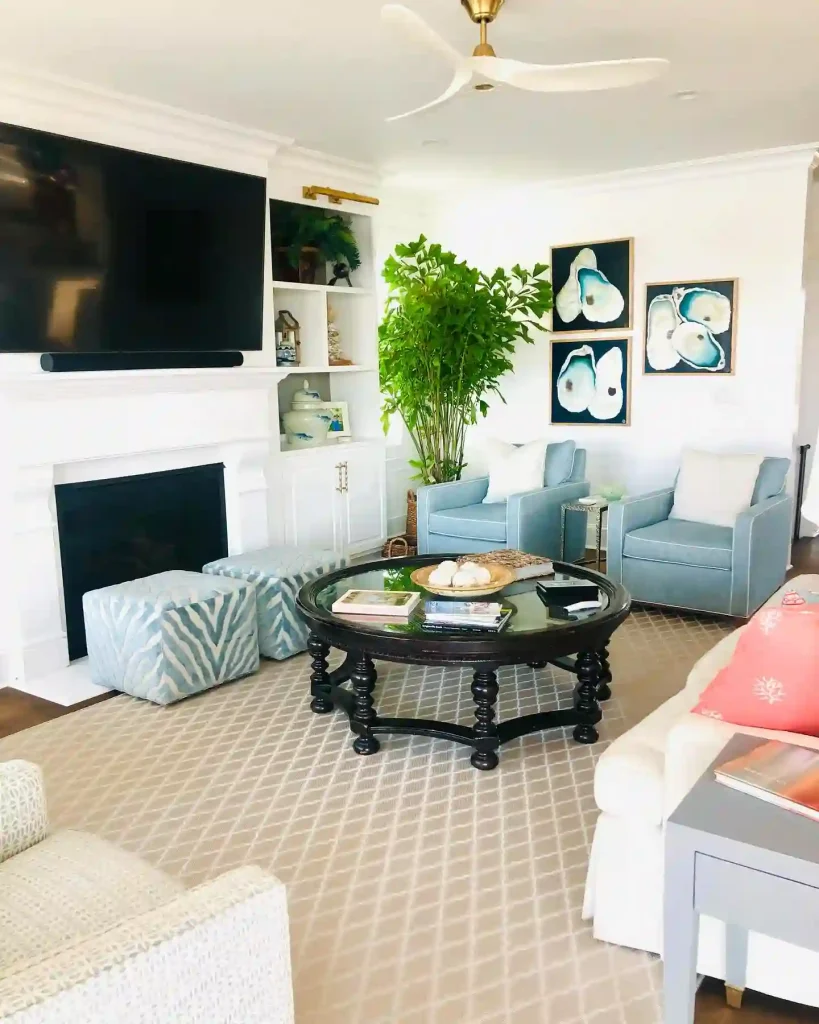 A light blue distressed coffee table and woven rugs complete the look, making this a perfect design for those who love a mix of modern farmhouse and coastal aesthetics.