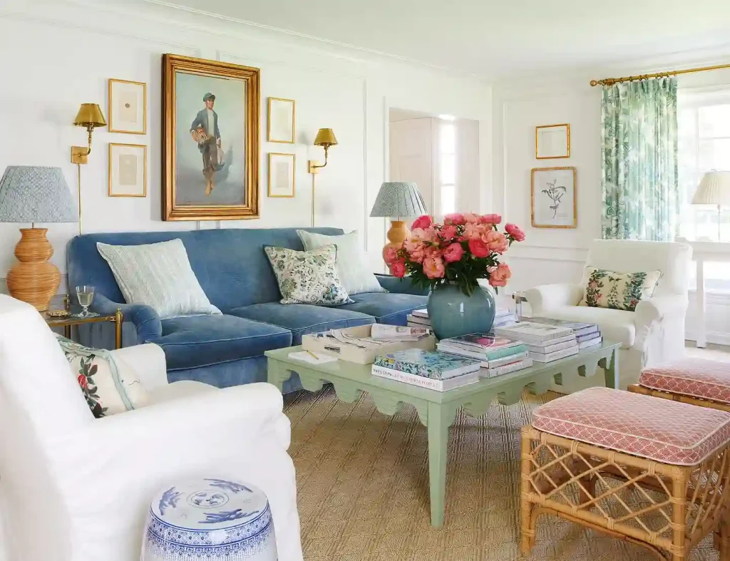 A plush blue velvet sofa takes center stage, surrounded by white slipcovered chairs and rattan stools that add texture.