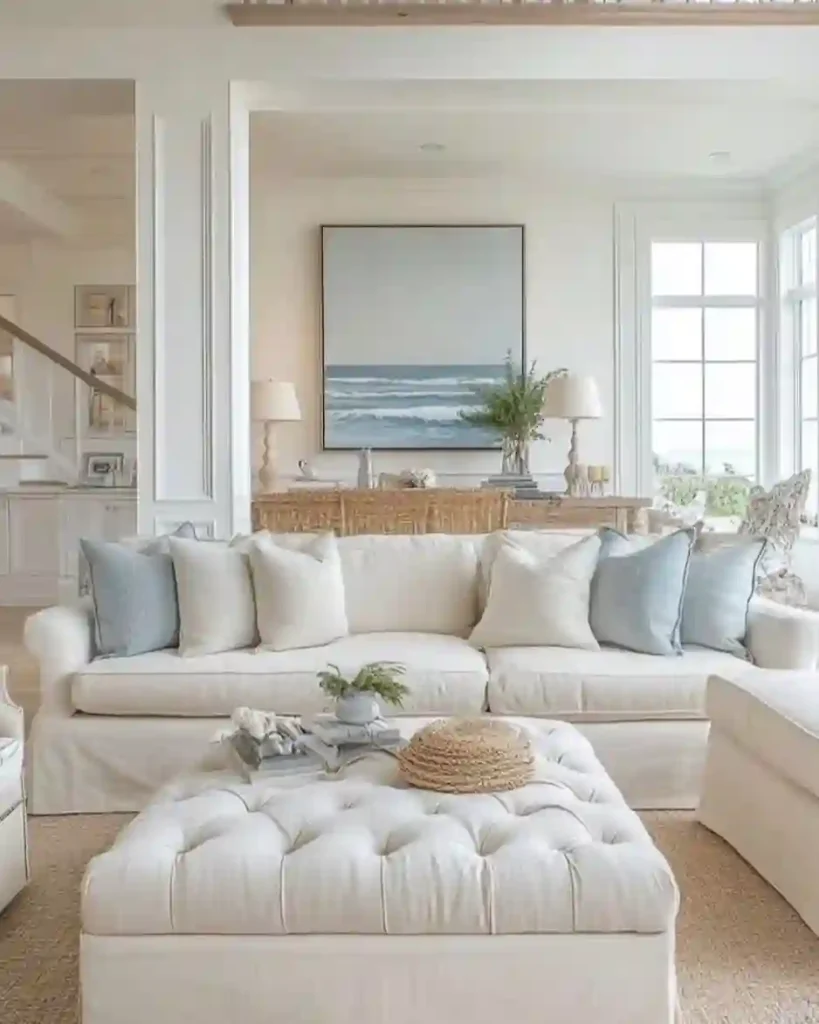 A neutral color palette with soft blues and whites creates a serene, beachy retreat. The oversized linen sofa is layered with plush pillows, while a tufted ottoman doubles as a coffee table, adding both comfort and style.