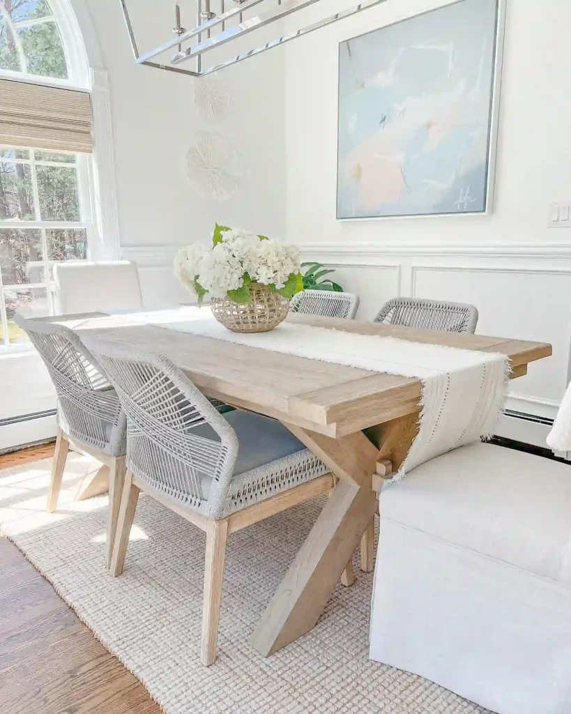 Soft wood tones, woven textures, and crisp white accents create a beautifully modern yet coastal dining space.