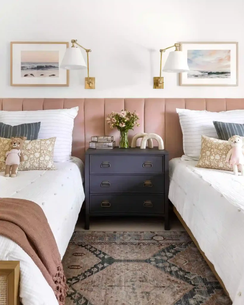 This twin bedroom embraces a soft and serene coastal design with a mix of blush pink, neutral tones, and vintage accents. The plush headboards, layered bedding, and textured pillows create a cozy retreat.