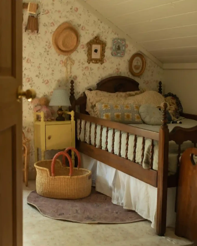 This snug attic bedroom leans into cottagecore nostalgia with its slanted ceiling and vintage floral wallpaper. A spindle bed frame adds a touch of tradition, paired with crochet blankets and plump pillows that feel homemade. A yellow nightstand adds a cheerful pop of color, while woven baskets and straw hats hung on the wall enhance the rustic character. It feels like a space pulled straight out of a countryside cottage, perfect for cozy mornings.