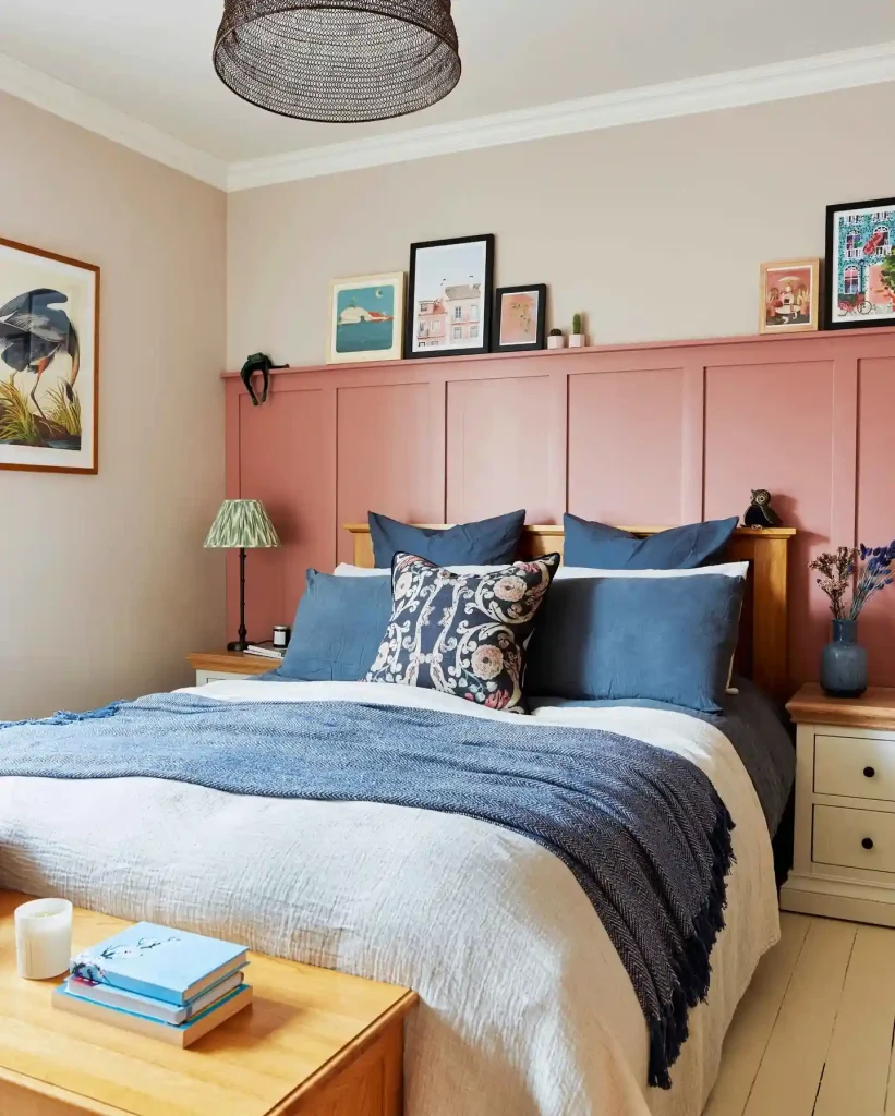This bedroom combines cottagecore coziness with modern playfulness. A dusty rose wainscoting wall frames the bed and adds warmth, while deep navy bedding creates a bold contrast. The layered throw blankets and patterned cushions give depth to the room. Above the bed, small framed prints add character without clutter. A pale wall color keeps the space bright, and wooden furniture grounds the look. This mix of classic paneling and bold colors makes the room inviting yet fresh.