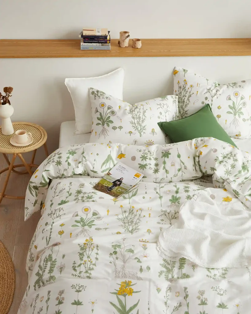 This bedroom feels like a garden brought indoors. The bedding is covered in cheerful botanical prints of daisies, leaves, and wildflowers in soft greens and yellows. White pillows and a green accent cushion add balance, keeping the space fresh and bright. A natural woven side table and simple books complete the look, making it both modern and true to the cottagecore spirit. This setup feels light, natural, and instantly calming.