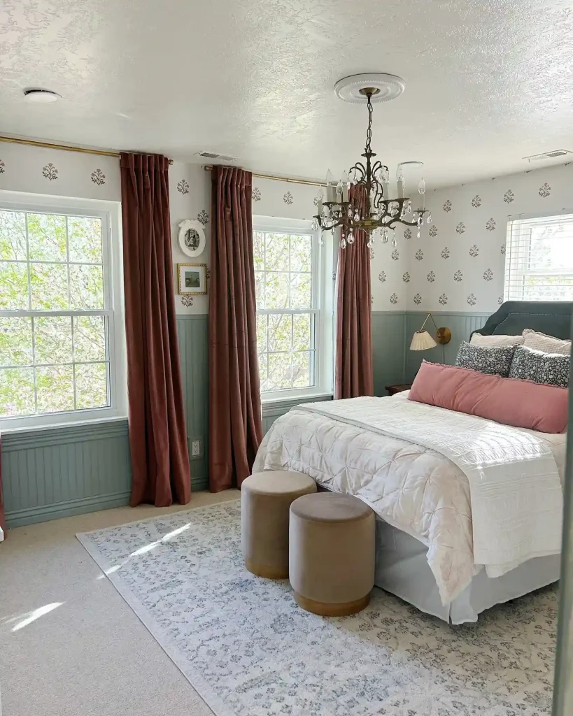 This airy bedroom is filled with natural light streaming through large windows. Pale patterned wallpaper and teal beadboard walls create a charming backdrop, while rich burgundy curtains add warmth. A simple white bed is layered with soft bedding and a long rose-colored pillow for contrast. The vintage chandelier adds elegance, while framed art keeps the rustic theme alive. It feels both refined and cozy, balancing cottagecore with a polished look.