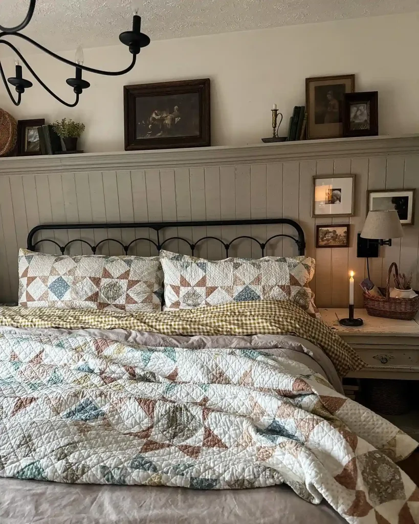 This room showcases cottagecore comfort at its finest with a patchwork quilt in muted pastels and earthy tones. The black iron bedframe adds vintage character, while layered gingham sheets and textured throws create depth. A wooden shelf above the bed displays old books and rustic art, tying the theme together. The candlelight on the nightstand adds a warm glow, making the whole room feel like a cozy retreat from another era.