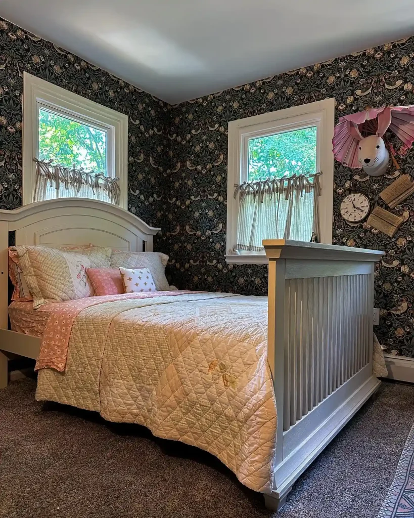 Dark floral wallpaper makes this small bedroom feel like a secret retreat. The white bed frame pops against the darker tones, while pastel bedding lightens the look. Small, frilly curtains on the windows add sweetness, and playful wall art like the bunny head brings a whimsical detail. Layered quilts and decorative pillows add comfort while sticking to soft cottagecore patterns. This balance of dark wallpaper with light furniture creates a snug yet cheerful space.