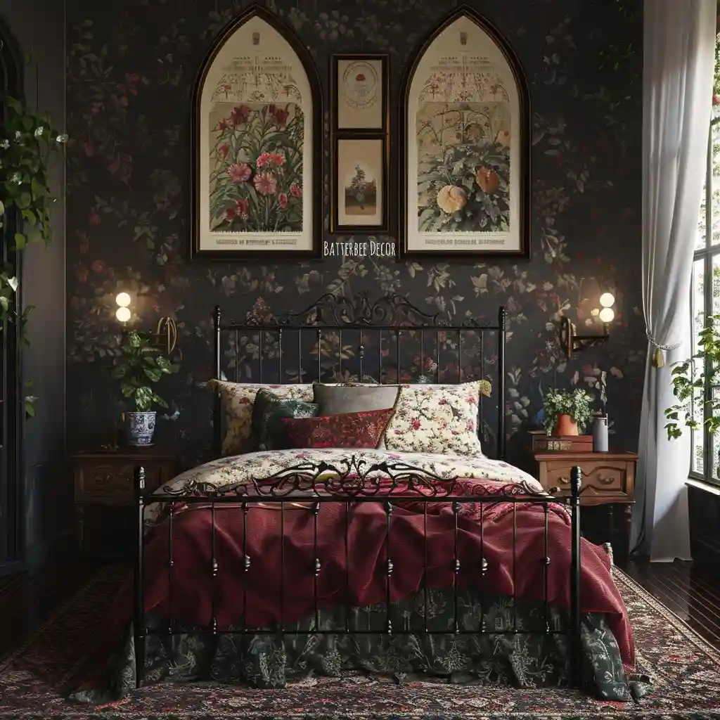 This bedroom leans into the moody side of cottagecore. Dark floral wallpaper covers the walls, paired with a black iron bedframe that adds vintage drama. Burgundy bedding and richly patterned pillows add depth, while botanical prints framed in gothic-style arches complete the old-world look. With warm lighting and indoor plants softening the darkness, this space feels romantic, dramatic, and timeless.