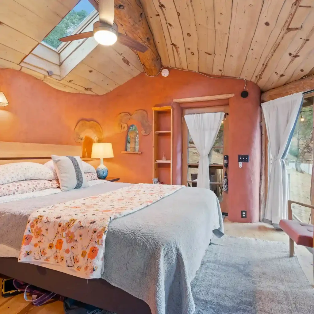 Warm clay-colored walls and a rustic wooden ceiling bring a grounding, natural vibe to this cottagecore bedroom. A skylight lets in soft daylight, while carved wooden accents and earthy textures add to the handmade feel. The bed is dressed in neutral tones with floral touches, making it both simple and charming. The use of natural wood beams and organic shapes makes this room feel connected to nature, like a cozy countryside hideaway.