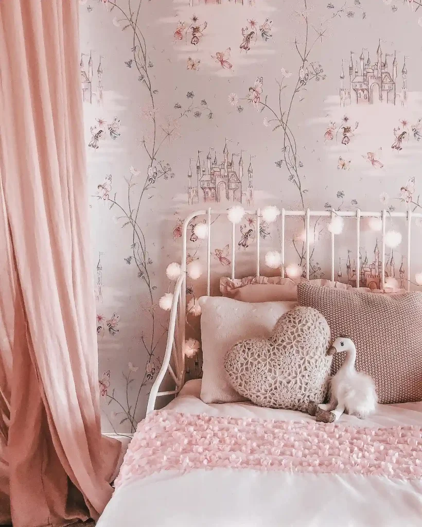 This cottagecore bedroom leans into fantasy with pastel pink tones and castle-themed wallpaper. A delicate iron bed frame is adorned with fluffy cushions and a cozy throw in soft textures. Sheer pink curtains flow down beside the bed, enhancing the dreamy atmosphere. The fairy lights and whimsical swan plush give the space a magical, storybook quality, perfect for anyone who loves a fairytale-inspired retreat.