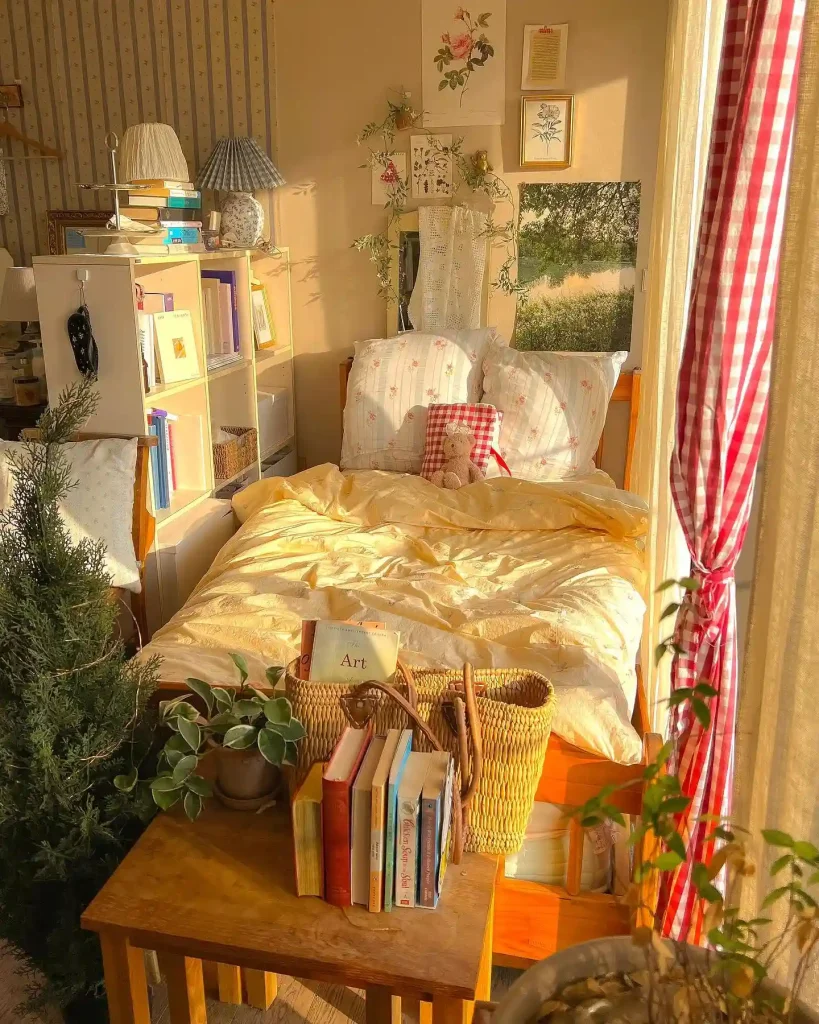 Warm sunlight fills this cottagecore bedroom, bathing everything in a golden glow. The bed is layered with cheerful yellow bedding and gingham pillows, giving it a sunny, welcoming feel. Surrounding the bed are books, plants, and woven baskets, which bring a natural, homey touch. A small teddy on the pillows adds sweetness, while red gingham curtains complete the countryside look. This room feels alive, as if it’s part of a summer afternoon spent reading.