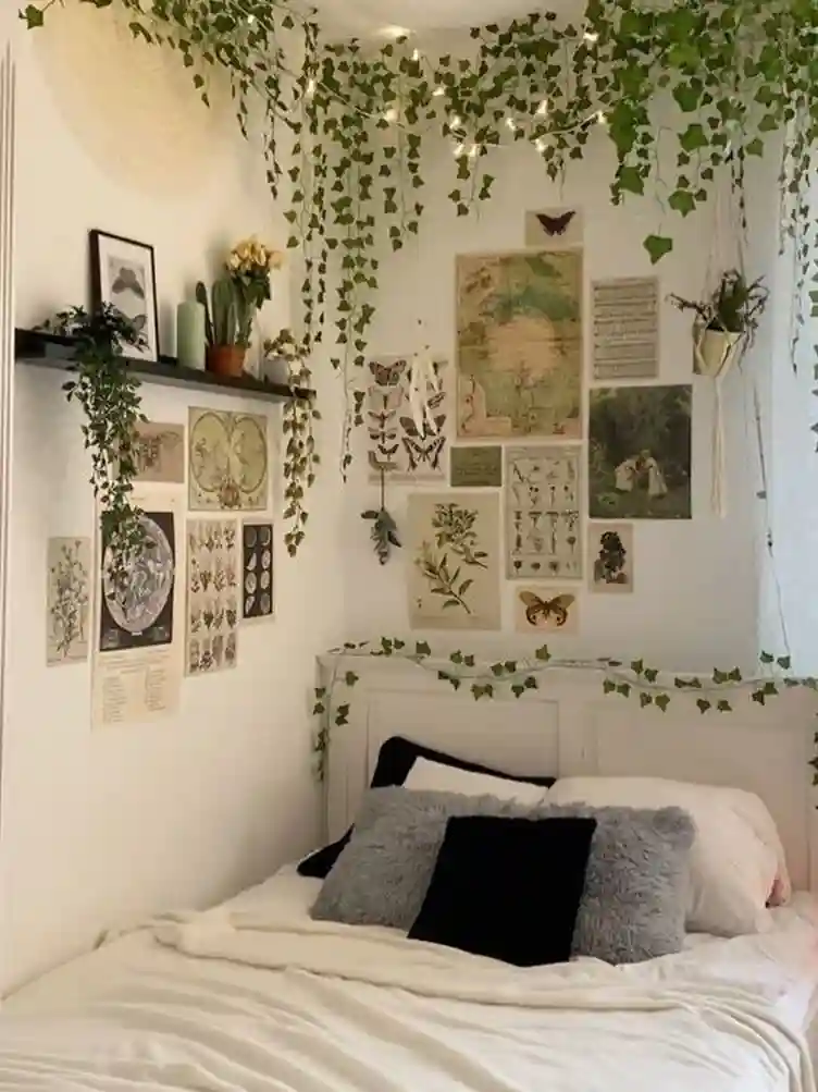 This whimsical cottagecore space transforms a small bedroom corner into a magical hideaway. Ivy garlands hang across the ceiling and walls, paired with botanical prints and vintage illustrations. The bed is dressed simply with white linens and soft gray pillows, letting the greenery and wall art take center stage. String lights woven through the ivy give the space a dreamy, fairy-tale glow, making it feel like an enchanted nook.