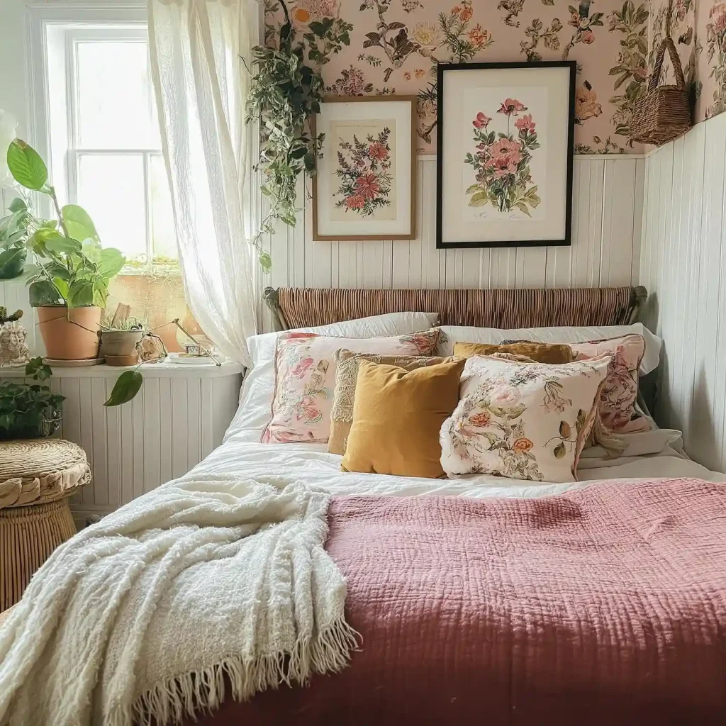 This bedroom bursts with cottagecore personality. A mix of floral cushions in pink and mustard tones bring vibrancy, while the floral wallpaper above white beadboard creates a layered, romantic backdrop. Potted plants by the window add greenery, enhancing the natural vibe. Soft draped curtains and rattan details tie in rustic charm. The space feels cheerful and blooming, like a garden brought indoors.