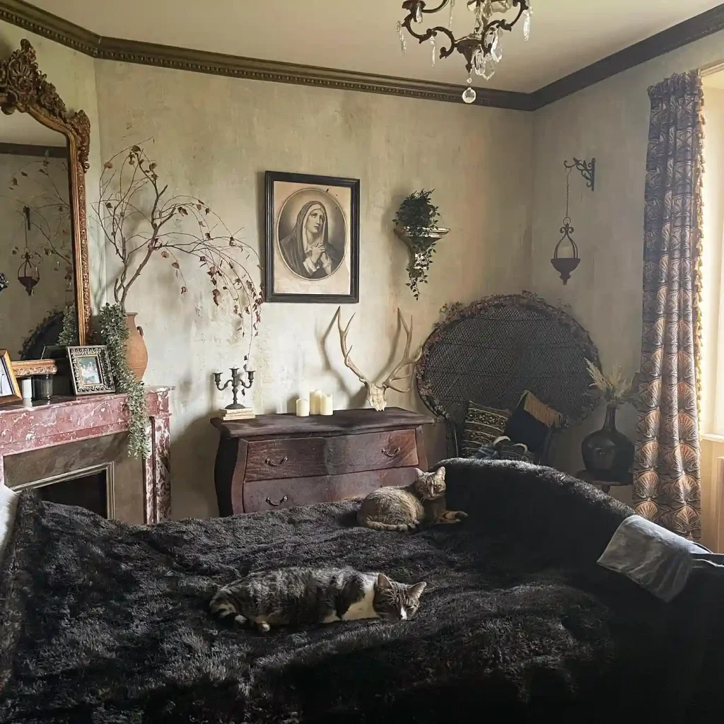This bedroom has a moody cottagecore feel with antique details and rich textures. The distressed walls, dark wooden furniture, and velvet-like bedding create a lived-in look. Decorative accents such as antlers, ornate mirrors, and vintage portraits bring character and depth. The room feels both cozy and dramatic, perfect for someone who loves the romantic side of cottagecore. Cats resting on the bed add even more homeliness, making the space feel deeply personal.