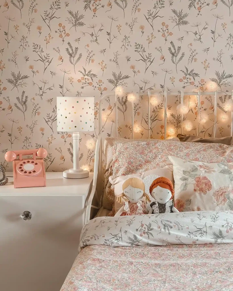 A whimsical cottagecore space where delicate floral wallpaper sets the stage. The iron bed frame is dressed in soft, pastel bedding with dainty prints that feel handmade. A vintage-style pink rotary phone adds a nostalgic detail, while fairy lights draped around the headboard cast a dreamy glow. With plush pillows and dolls sitting at the foot of the bed, the space feels warm, playful, and filled with character.