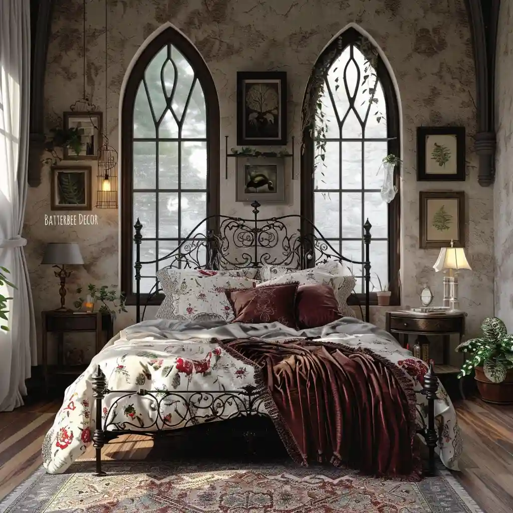 This room feels straight out of a historic novel. The stone-textured walls and arched windows frame the bed beautifully, while an ornate iron headboard enhances the vintage look. The bed is dressed in soft florals with rich burgundy accents, balancing romance with rustic charm. Hanging lanterns and trailing greenery add character, while patterned rugs anchor the room. It’s a perfect mix of moody elegance and cottage warmth.