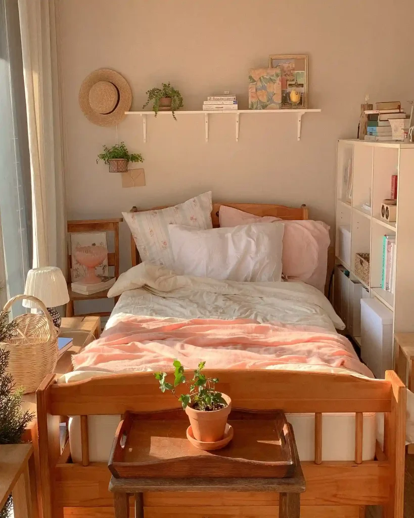 Golden sunlight fills this bedroom, bouncing off pale peach walls and warm wooden furniture. The bed is layered with crisp white sheets, pink pillows, and a soft throw in blush tones. Hanging plants, wicker baskets, and books add a homely, handmade touch. A straw hat on the wall enhances the countryside feel. This room captures the heart of cottagecore: simple, sunlit, and charming.