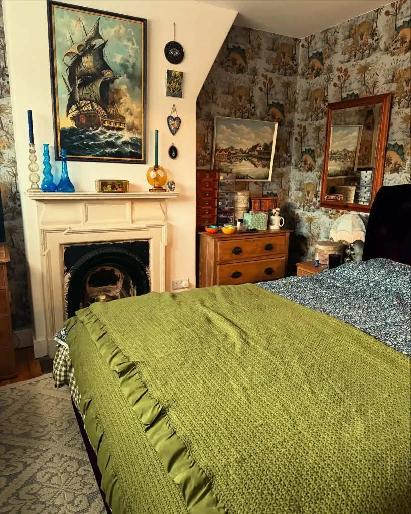 This bold bedroom mixes rich patterns and dramatic details. The green knitted blanket contrasts with dark blue bedding, while a nautical painting above the fireplace adds vintage character. Patterned wallpaper in earthy tones surrounds the space, while mismatched glass bottles and antiques decorate shelves and mantels. The eclectic layering of colors, from olive green to navy blue, makes this cottagecore room feel like a storybook retreat.