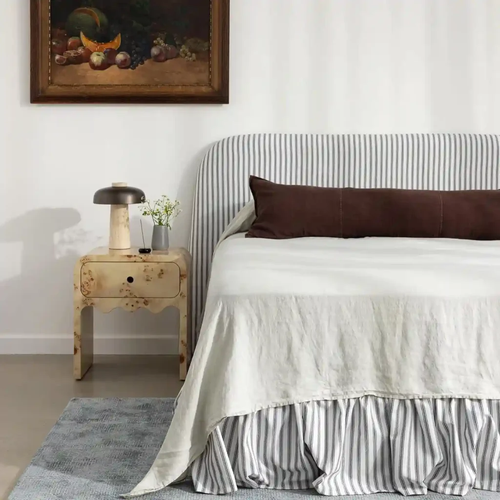 Here, cottagecore gets a crisp, refined update. The bed features a striped headboard and a ruffled striped skirt, paired with simple linen bedding. Neutral tones dominate, creating a clean and airy look, while a dark brown cushion adds depth. A small rustic nightstand with a mushroom-style lamp and a framed still-life painting above the bed bring the cottagecore aesthetic to life in a subtle way.