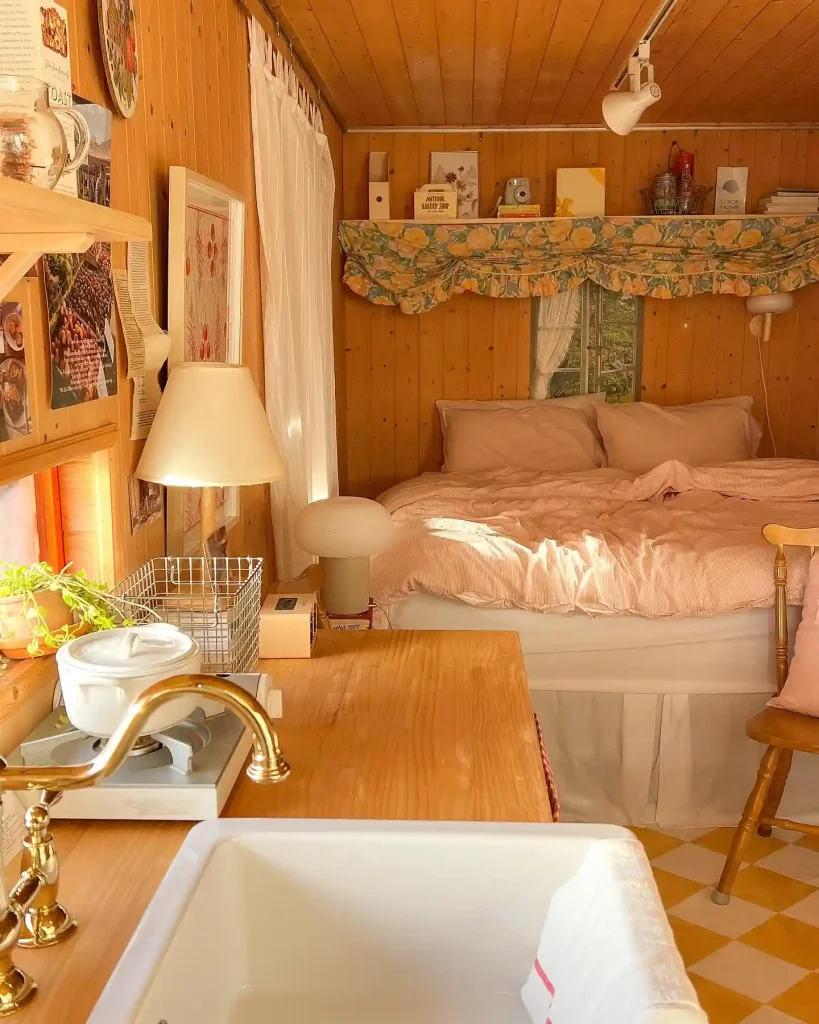 This small wooden cottage room shows how cozy a compact space can feel. Honey-toned paneling surrounds the bed, with a floral ruffle curtain adding sweetness. Pale pink bedding softens the look, while shelves above the bed display books and little treasures. The soft lighting makes the space feel warm and snug, like a tiny retreat tucked away in the countryside.