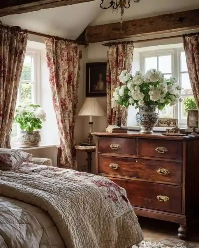 This space feels wonderfully classic. A quilted bedspread in floral tones pairs with vintage curtains in a similar print. Wooden beams and antique furniture add rustic authenticity. A vase of fresh flowers brings life to the room, tying it to nature. Everything feels like a countryside home passed down through generations warm, layered, and filled with stories.