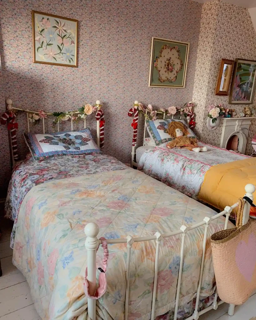 A sweet cottagecore setup with two antique-style iron beds, each layered in colorful floral quilts. The soft pastel wallpaper sets a gentle backdrop, while garlands of faux flowers draped along the bed frames bring a whimsical, handmade touch. Vintage art and embroidered pieces on the wall complete the look, giving the space a nostalgic feel. The mix of textures cotton quilts, soft pillows, and crocheted details creates warmth that feels cozy and lived-in. It’s the perfect shared bedroom for sisters or guests.