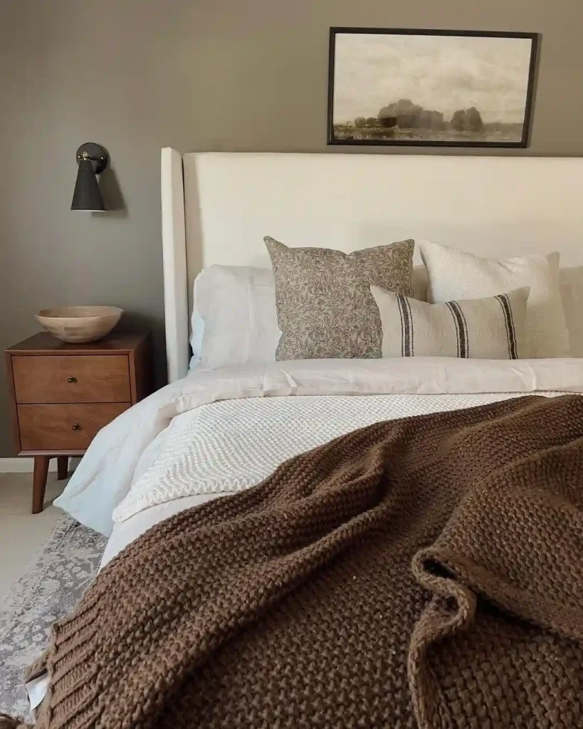This bedroom pairs simplicity with cottagecore charm using earthy neutrals. The crisp white headboard contrasts with soft gray walls, while patterned throw pillows add texture. A chunky knitted blanket in deep brown anchors the bed, creating warmth and coziness. Wooden furniture with clean lines adds a mid-century touch, and a minimal wall sconce provides gentle lighting. The whole space feels calm, natural, and grounding, perfect for those who love understated cottagecore style.