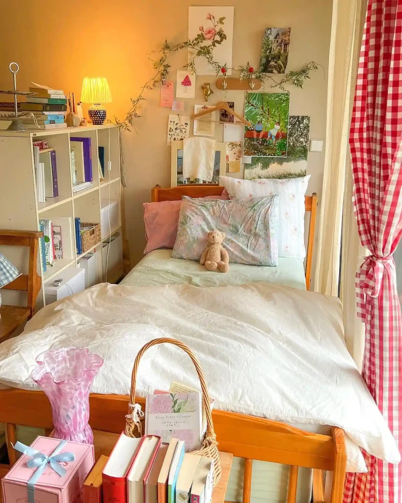 This bedroom blends cottagecore charm with a personal, creative touch. A wooden bed sits by a wall filled with postcards, floral prints, and clippings, turning the headboard area into an artful collage. Soft fairy lights and trailing greenery give it a whimsical air, while the red gingham curtains add a classic countryside detail. A small bookshelf by the bed holds favorite reads, making the space feel practical and cozy. The mix of pale linens and floral pillows balances comfort with charm.