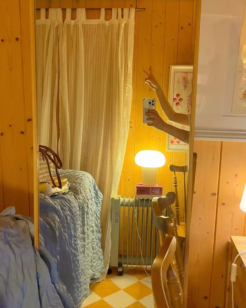 Here, cottagecore meets rustic cabin style. Warm wooden paneling covers the walls, while soft, gauzy curtains let in golden light. A quilted blue coverlet on the bed adds a pop of color against the honey-toned wood. A simple glowing lamp enhances the snug atmosphere, reflecting off the wood grain. Vintage framed art and classic wooden chairs add to the lived-in charm. This bedroom feels like a perfect retreat after a long day, inviting you to slow down and rest.