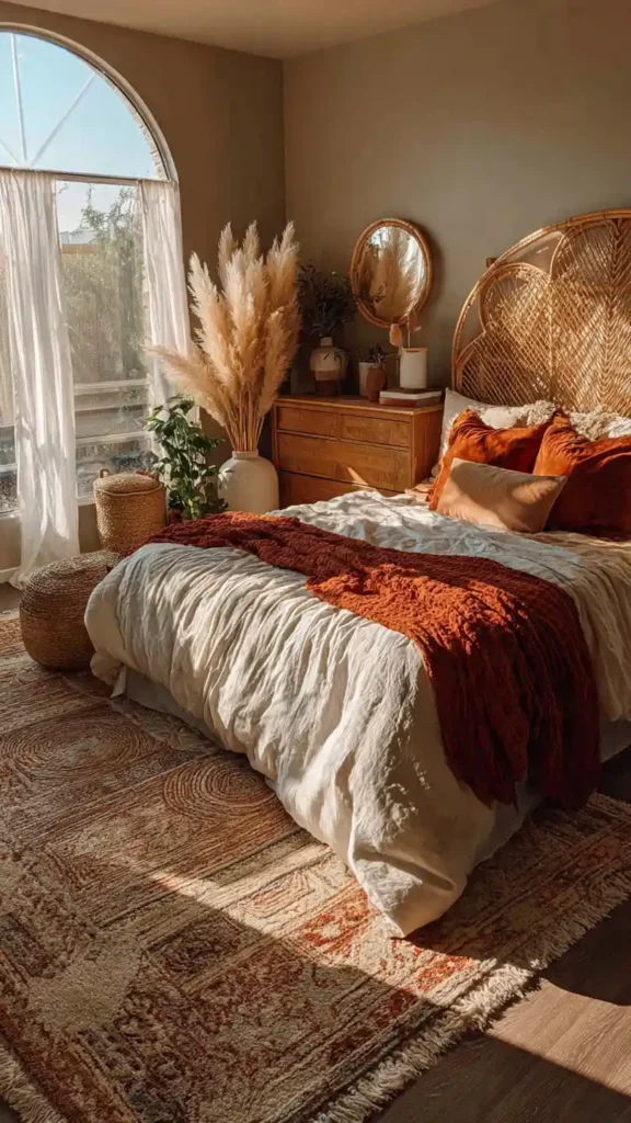 A rattan headboard instantly sets the tone for a relaxed boho space. Layer rugs under the bed and mix terracotta, cream, and muted browns in your bedding. Pampas grass or simple dried stems add height and softness. Keep lighting warm and low to maintain the cozy mood. The key here is mixing textures woven, linen, cotton while staying within a warm, earthy color palette.
