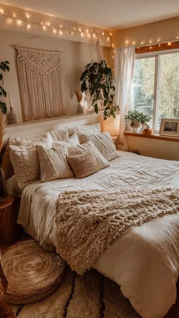 Macrame wall art brings texture without cluttering the room. Pair it with layered neutral bedding and woven accents to keep the look cohesive. Add soft fairy lights or a warm bedside lamp for gentle evening glow. Plants near a window introduce life and balance. This cozy style feels creative yet calming, especially when you avoid overly bold colors and stick to warm neutrals.