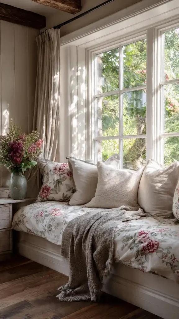 A built-in window bench instantly adds charm and function. Layer cushions and soft throws to make the nook feel inviting. Light floral bedding and rustic wood accents complete the cozy countryside look. Natural daylight plays a big role here, so keep curtains sheer. This setup feels personal and comforting, especially when styled with warm lighting for evenings and soft neutral tones throughout.