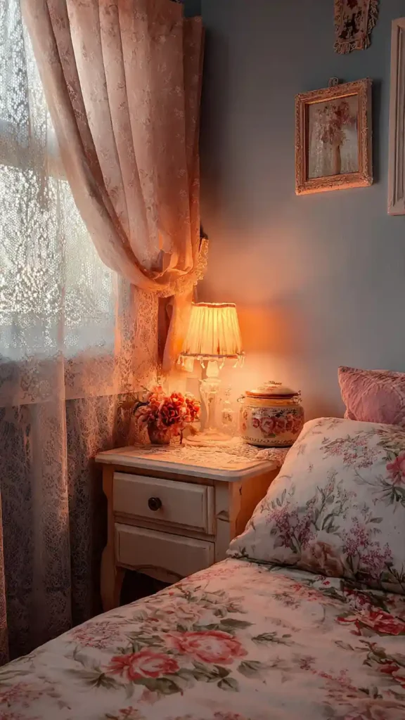 Floral bedding sets the tone for a charming cottage-inspired space. Soft pastel walls and a vintage nightstand reinforce the countryside feel. Add lace curtains and warm bedside lamps for that gentle evening glow. Keep textures soft and layered—quilts, cotton sheets, woven rugs. The space should feel romantic and slightly nostalgic without looking busy. Stick to muted colors to maintain a relaxed mood.
