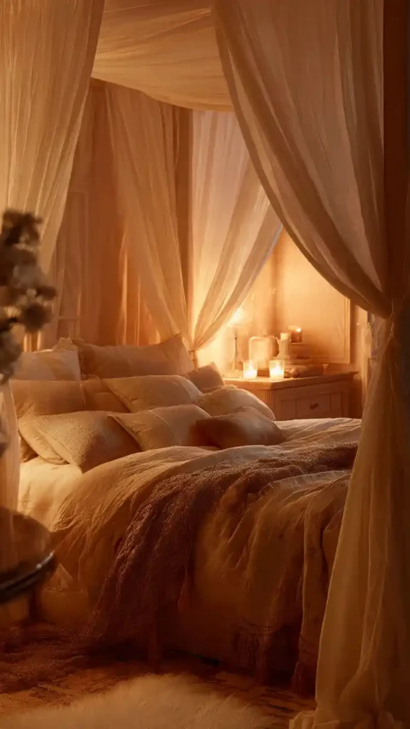 A canopy bed instantly adds softness and romance. Use sheer white curtains to keep the look light rather than heavy. Layer cream or neutral bedding with textured throws for extra warmth. Keep lighting subtle small bedside lamps or wall sconces work beautifully. This design feels intimate and elegant without requiring bold colors. The flowing fabric makes the space feel wrapped and restful.