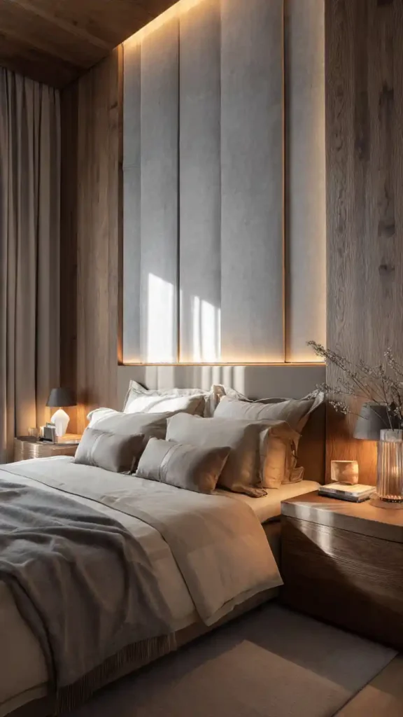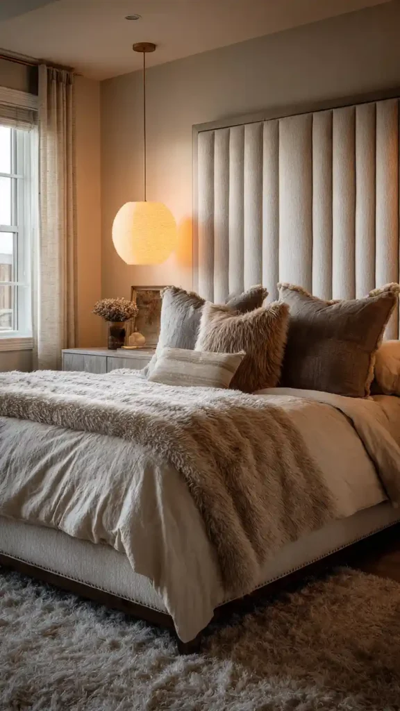 A tall upholstered headboard adds instant softness and presence. Choose neutral fabric tones to keep the space calming. Layer bedding in coordinating shades and add a plush rug beneath the bed for comfort underfoot. Warm ambient lighting highlights the headboard texture beautifully. Keep accessories minimal and let the layered textiles create the cozy feel. This look feels polished yet inviting.