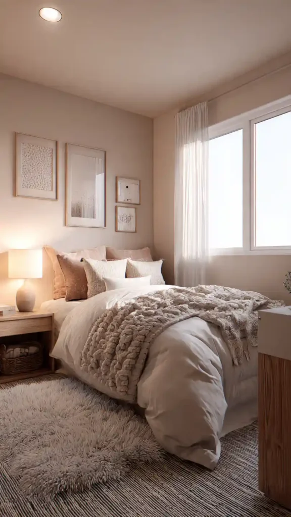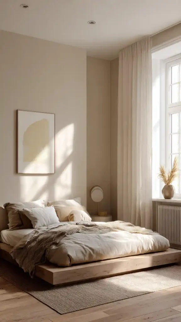Soft beige walls create a calming base that instantly feels warm. A low platform bed with layered neutral bedding keeps the design clean. Add a subtle textured throw and warm bedside lighting to prevent the space from feeling flat. Avoid busy decor and keep surfaces mostly clear. The cozy factor comes from the soft color palette and layered textiles rather than decorative extras.