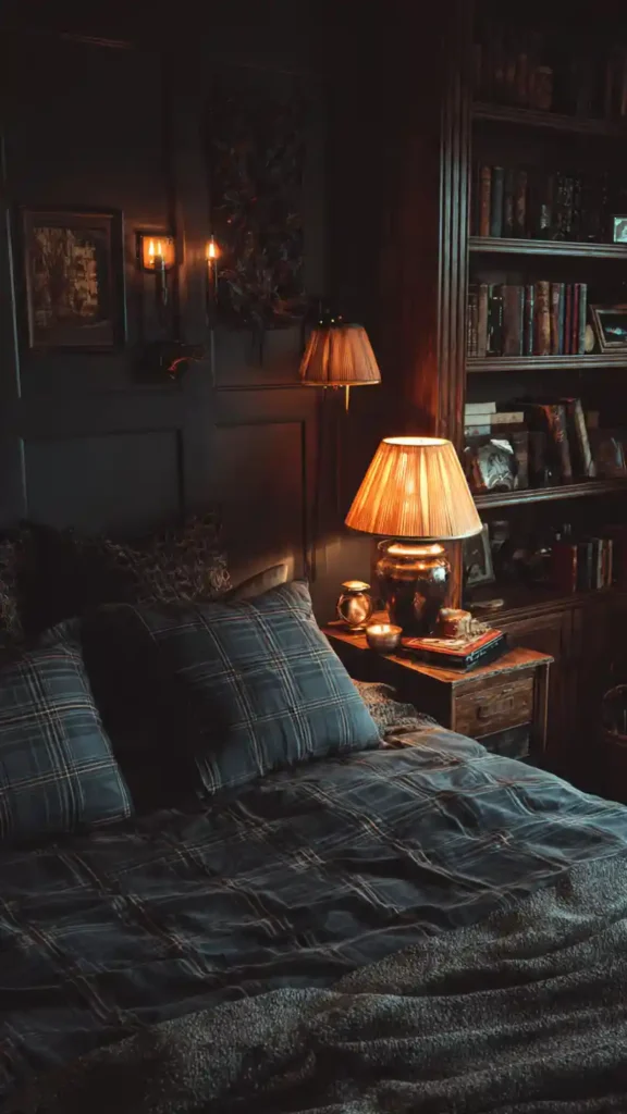 Deep brown walls and wooden bookshelves create a rich, layered atmosphere. Use plaid or textured bedding in warm tones to prevent the space from feeling too dark. A warm desk lamp or bedside lamp provides focused light that enhances the cozy mood. Keep decorative pieces minimal but meaningful. The overall look should feel thoughtful and slightly dramatic without becoming overwhelming.