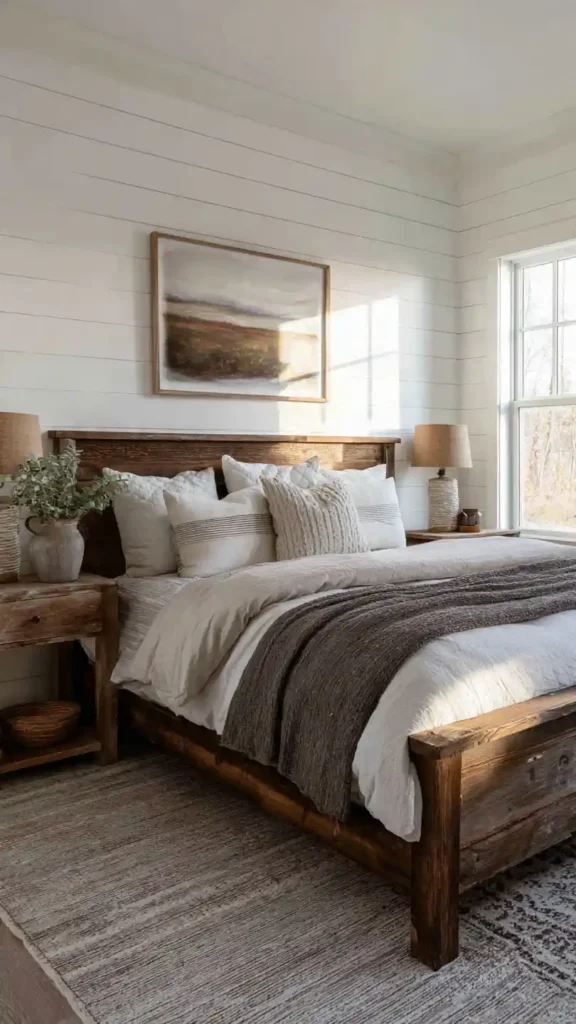 5. Farmhouse Cozy Bedroom with Shiplap Walls