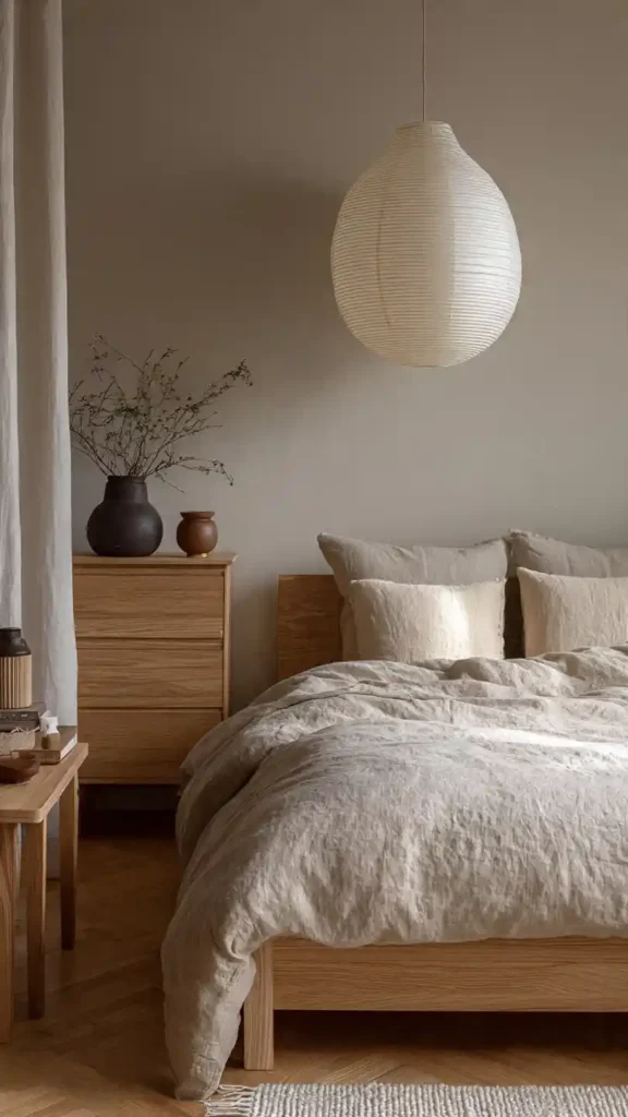 20. Japandi Bedroom with Soft Paper Lantern Lighting