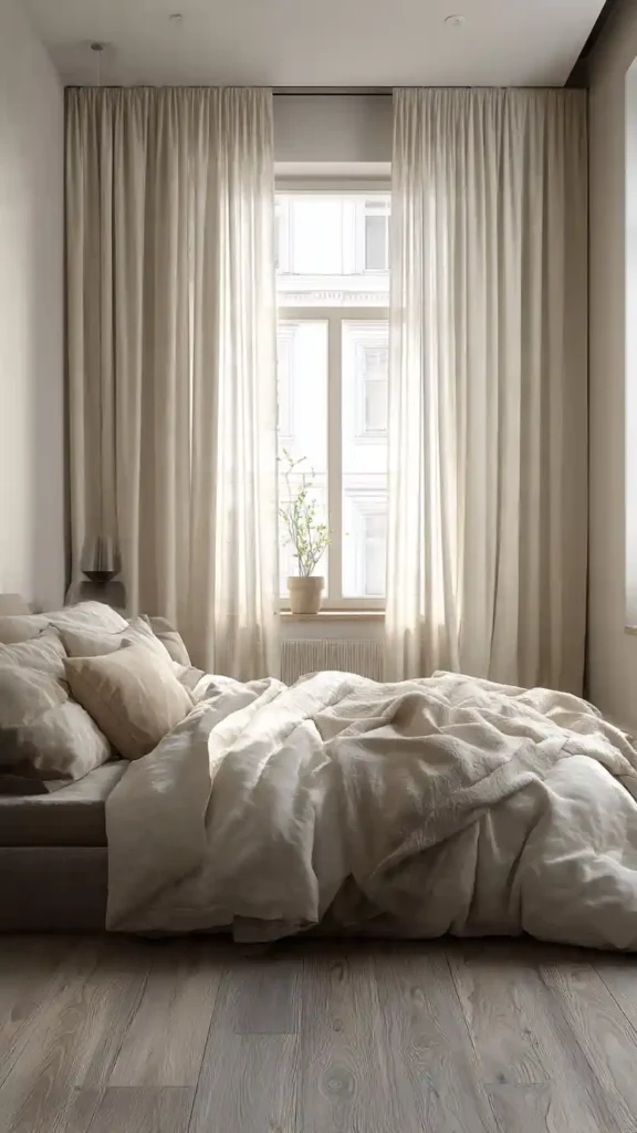 10. Minimal Cozy Bedroom with Floor-to-Ceiling Curtains