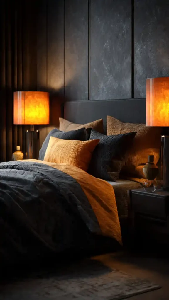 2. Moody Charcoal Bedroom with Warm Lighting