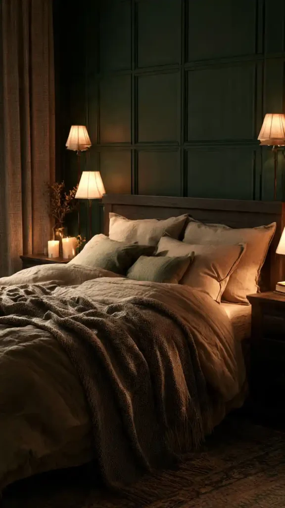 Deep forest green walls instantly create a cocoon-like feeling. The darker backdrop makes warm bedside lamps glow beautifully, especially when paired with layered beige and brown bedding. Add dark wood nightstands and textured throws to build depth without clutter. Keep lighting soft and warm rather than bright overhead fixtures. This look works best when fabrics feel rich linen, cotton, velvet. The contrast between dark walls and soft textiles is what makes the space feel intimate and restful.