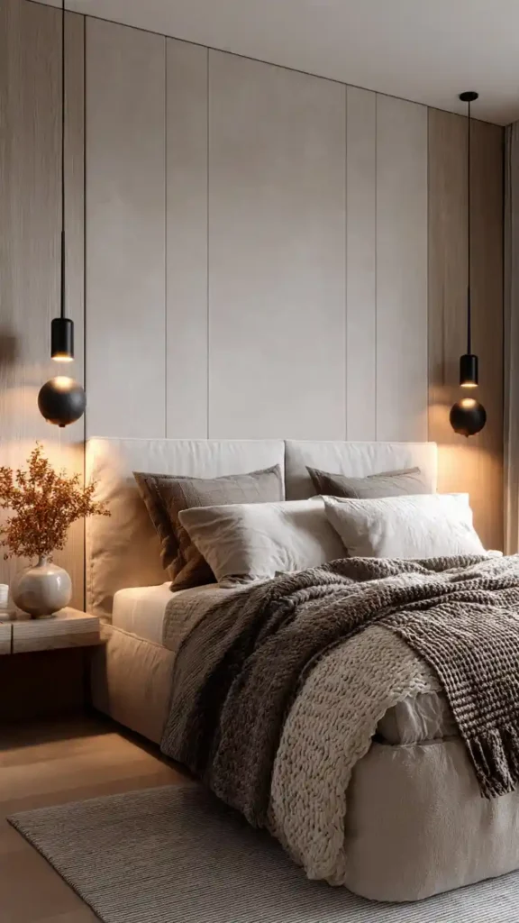 Textured wall paneling adds depth without overwhelming the space. Pair beige bedding layers with wood nightstands to keep the palette grounded. Subtle warm lighting enhances the texture on the wall and creates soft shadows. Avoid bright or cool tones. This look feels elevated but still calm. Keep furniture simple and proportional so the wall detail becomes the quiet focal point of the room.